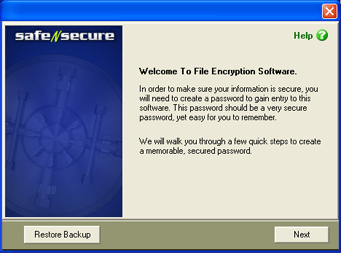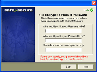 Setting up a user account with Safe-n-Secure is fast and easy. File Encryption walks your through setting up a user account and offers tips for creating a solid password.