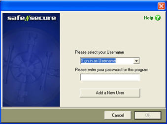 In order to access Safe-n-Secure File Encryption, you will be presented with a password screen. Simply choose the your username from the dropdown list. Then add the password for this user.